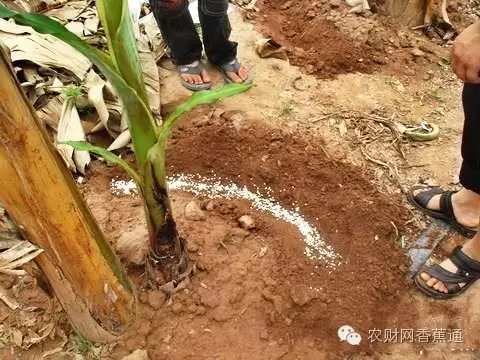 “要想香蕉收成好,不但要有好的施肥方法,还需要选对好肥料。”王添泉介绍,因为香蕉没有主根,属须根系,由地下球茎抽生肉质不定根,多数分布在土壤土层,形成水平根系,不耐涝、不耐旱、不耐肥,生长期新根抽生旺盛,抽蕾后不再抽生新根,所以香蕉施肥必须要做到少施、勤施的原则。香蕉底肥在施足有机肥的情况下,每亩施阿康16-16-16复合肥15~30公斤,上面铺5~10厘米碎土,然后移栽,移栽时香蕉根系不宜与肥料直接接触。